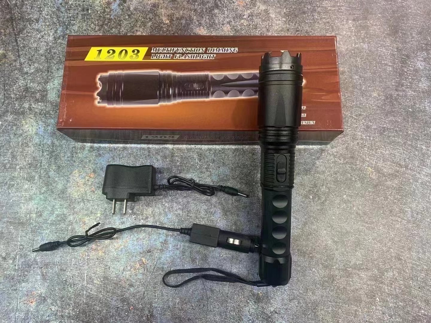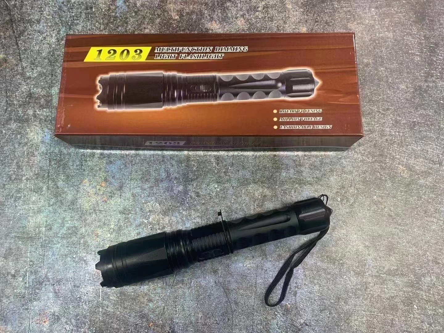 强光手电功能:1203型电击棍具备三档照明炫目功能,无极变焦。